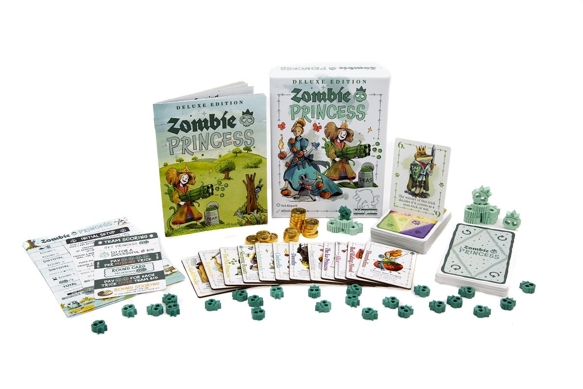 In Zombie Princess, the follow-up to the trick-avoidance card game Rebel Princess, you're bidding on how many tricks you think you (and perhaps a teammate) can take each round. But asymmetric Princess powers can shift momentum and bring in zombie heads that provide points or room to miss your bids.